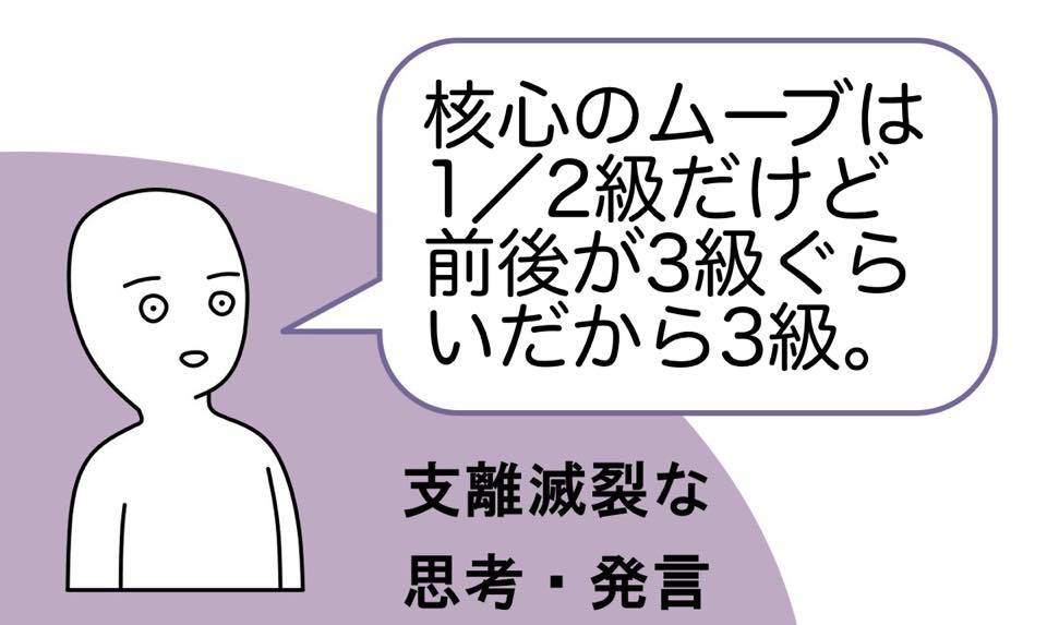 最初の画像のように1/2級の要素がありながら3級になるグレーディングに疑問を持つのであれば、保持でもムーブでも3級要素があれば3級にしないと辻褄が合わないですよね。