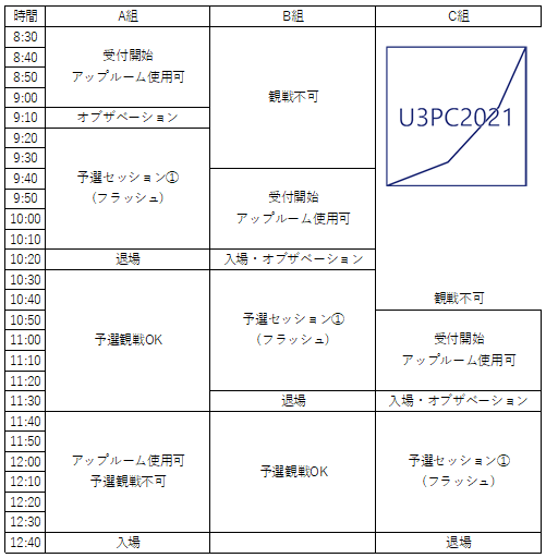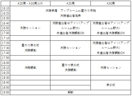 〇A20男・A30男の選手は、他のカテゴリーの決勝の間はアイソレーションルーム(アップルーム)もしくは競技の見えない屋外(敷地内)で待機していてください。