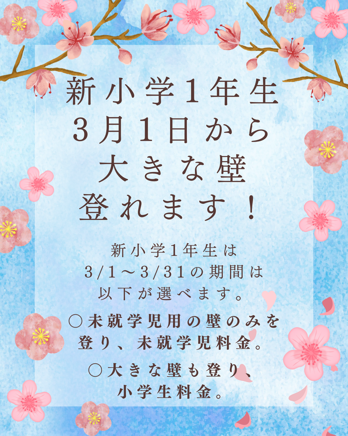 3月中は、就学時用の壁だけ登り未就学児料金・大きな壁も登り小学生料金、が選べますので、お子様にあったお好きな方をお選びくださいませ。